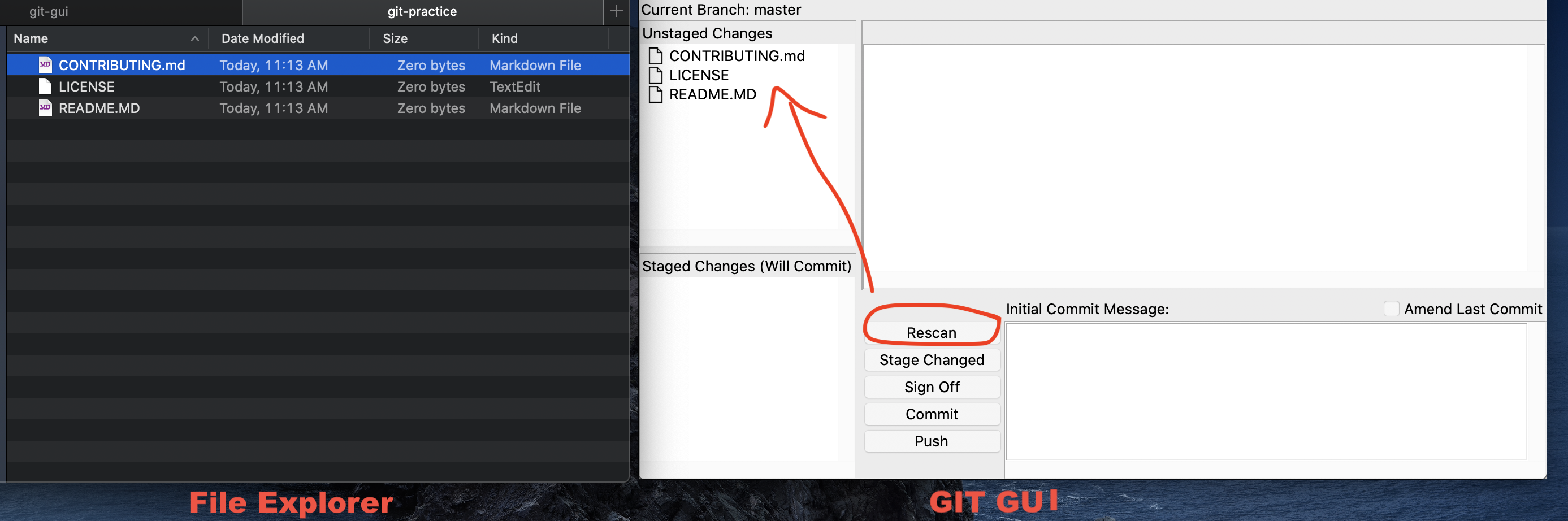 - Look at the status of the files changed. On GUI, it can be seen by looking at the “Unstaged Changes” and “Staged Changes (will commit)” sections.