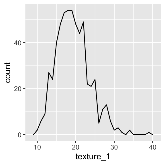 ggplot(aes(x= texture_1), data = wdbc)+ geom_freqpoly(binwidth =1)