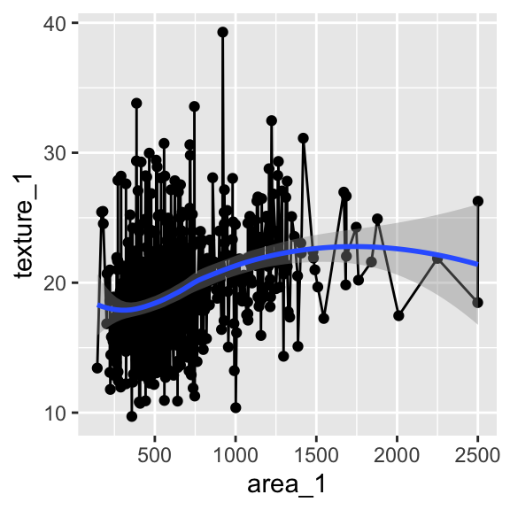 ggplot(aes(x = area_1, y = texture_1), data = wdbc)+geom_line()+geom_point()+geom_smooth() ## `geom_smooth()` using method = 'loess' and formula 'y ~ x'