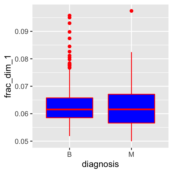 ggplot(aes(x =diagnosis, y = frac_dim_1, color = I("red"), fill = I("blue")),data = wdbc) +