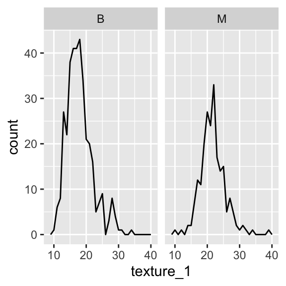 ggplot(aes(x =texture_1), data = wdbc)+geom_freqpoly(binwidth = 1) +facet_wrap(~diagnosis)