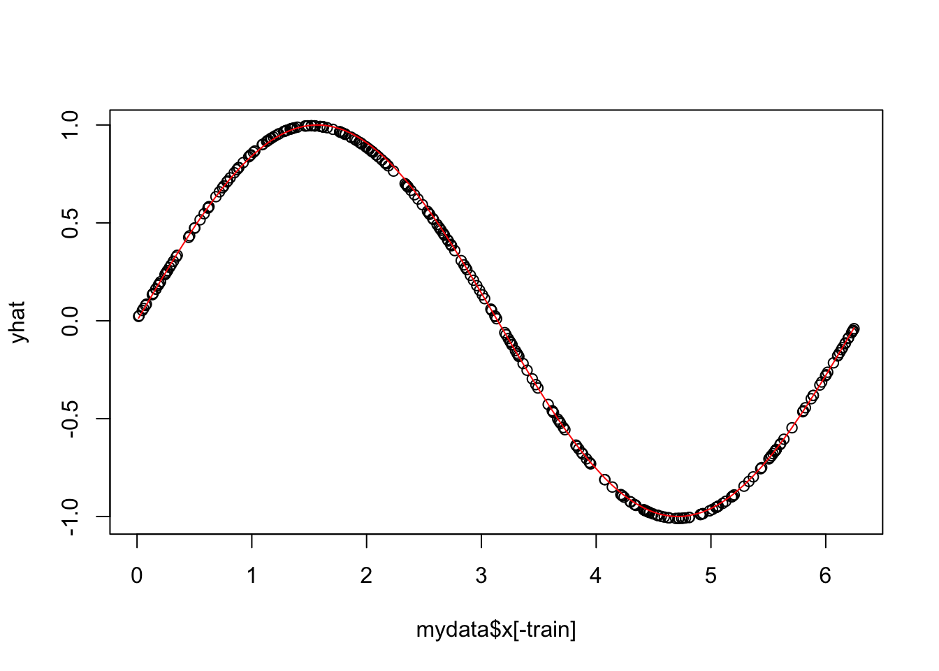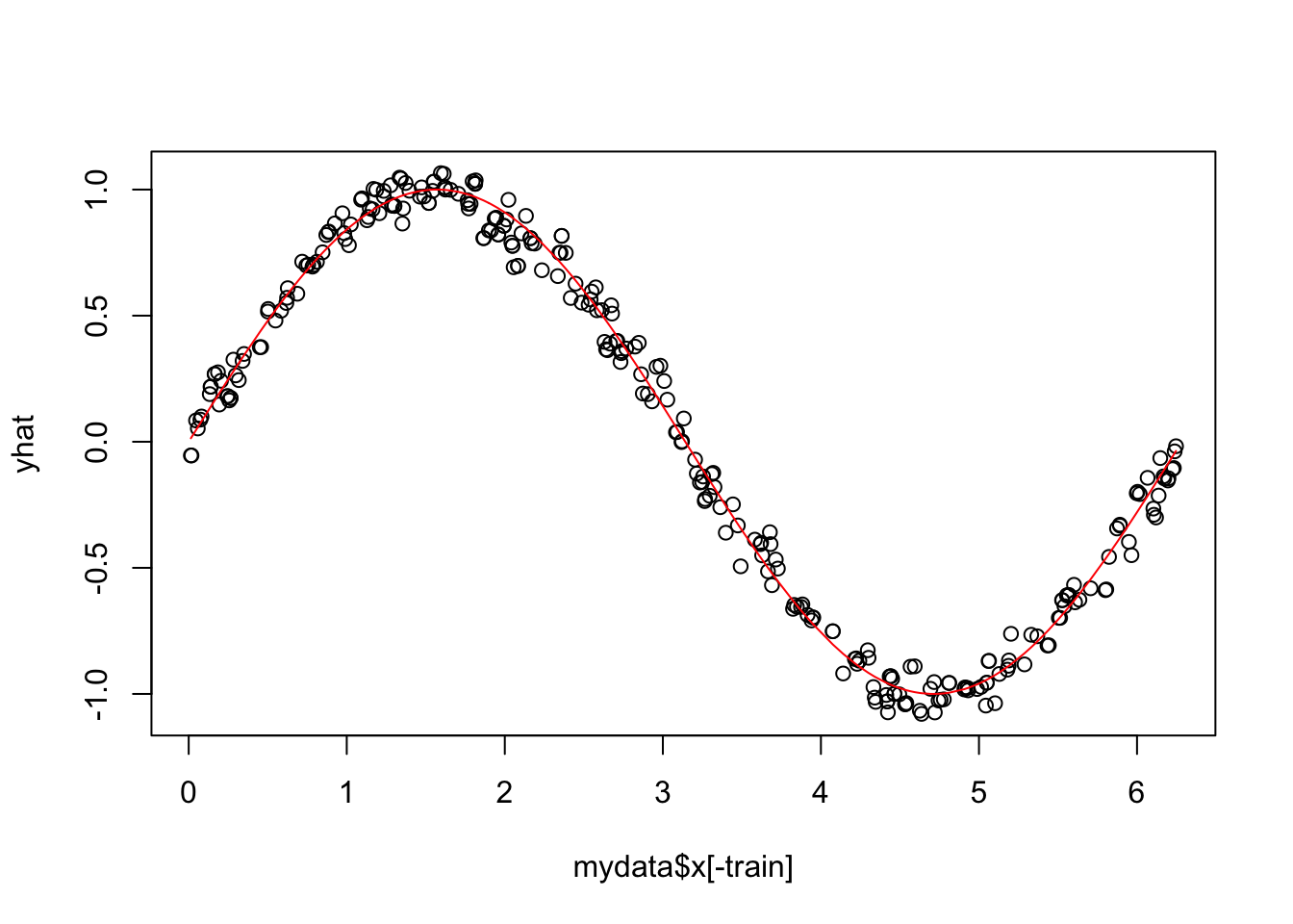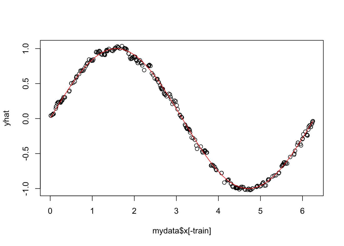yhat=(kknn(y~x,train=mydata[train,],test=mydata[-train,],